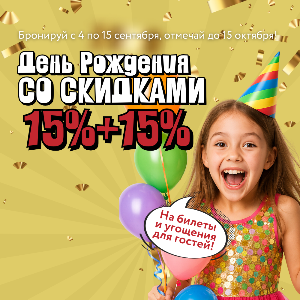Бронируй День рождения с 4 по 15 сентября 2025 г., а отмечай до 15 октября: